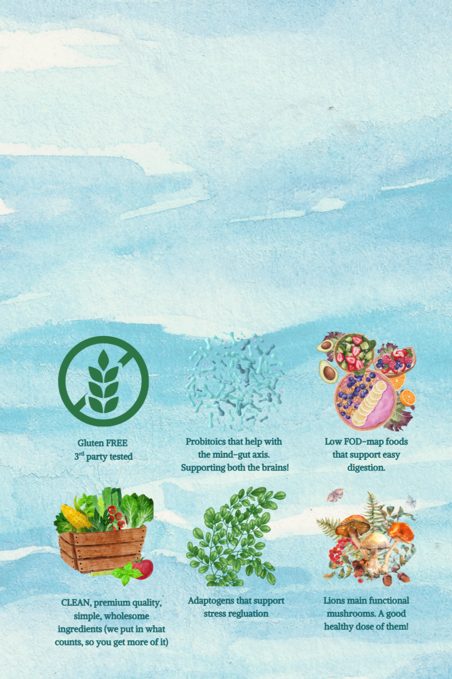Our premier product is a yummy chocolate powder with no added sugar, artificial flavors, or any nonsense! Only premium fruits, veggies, adaptogens, and probiotics!